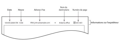 Si la machine est réglée pour que ces informations soient imprimées sur l'en-tête des documents envoyés, et si certains éléments n'ont pas été enregistrés, seuls les éléments enregistrés et le nombre total de pages s'impriment sur l'en-tête.