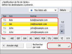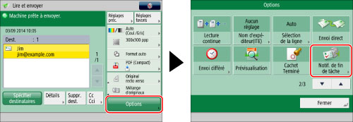 Pour envoyer une indication de fin de tâche, il est nécessaire d'enregistrer les adresses e-mail dans le carnet d'adresses local ou sous un bouton de composition 1 touche au préalable. (Voir "Mémorisation d'une adresse électronique".)