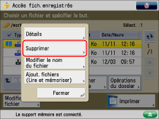 Il est possible de vérifier les informations détaillées des fichiers sur support mémoire (nom de dossier, emplacement, date de modification, etc.) et d'ajouter ou de supprimer des fichiers.