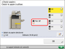 Si le papier chargé dans le plateau multifonctions n'est pas celui à spécifier, retirer toutes les feuilles puis charger le papier à spécifier dans le plateau multifonctions. (Voir "Chargement du papier dans le plateau multifonctions".)