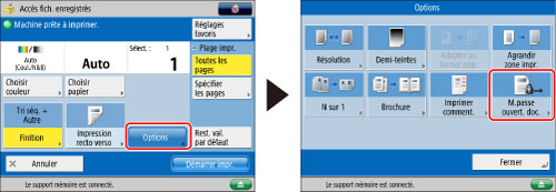Pour imprimer les fichiers PDF dont l'impression n'est pas autorisée ou pour imprimer en haute résolution des fichiers PDF qui n'autorisent que l'impression à basse résolution, saisir le mot de passe maître.