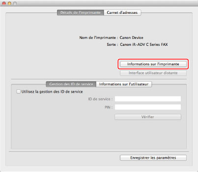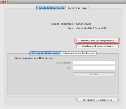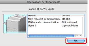 Si le nom du pilote de télécopieur indiqué en haut de la boîte de dialogue Informations sur l'imprimante] et celui présenté comme [Nom récupéré de l'imprimante] ne correspondent pas, il se peut que les fonctions du télécopieur ne donnent pas les résultats attendus. Si les noms sont différents, supprimer le télécopieur qui a été ajouté dans [Préférences Système], puis l'ajouter de nouveau. Pour plus d'informations, voir le "Guide du pilote de fax Canon" (voir " Installation").