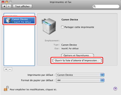 Sélectionner le télécopieur → cliquer sur [Ouvrir la liste d'attente d'impression].