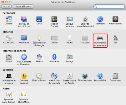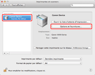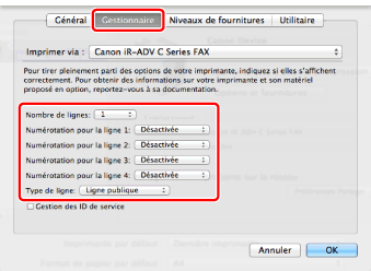 Si vous utilisez Mac OS X 10.7 ou une version antérieure, vérifiez que le pilote correspondant au télécopieur utilisé est sélectionné pour [Imprimer via]. Pour le nom du pilote correspondant à votre télécopieur, reportez-vous au fichier Readme.