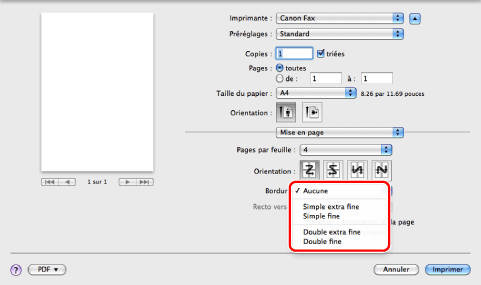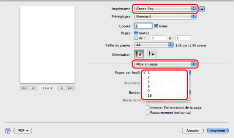 Sélectionner le télécopieur utilisé → [Mise en page] → définir le nombre de pages à reproduire sur une seule feuille dans [Pages par feuille].