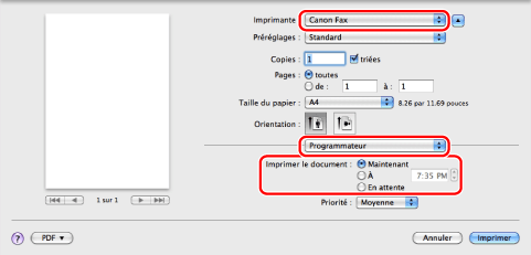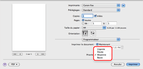 Il est possible de définir l'heure d'envoi d'un document, ainsi que le niveau de priorité de ce document.