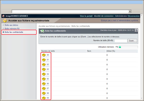 On peut également saisir le numéro de la boîte de réception souhaitée dans la zone <Numéro de boîte (00-49)> → cliquer sur [Ouvrir...].