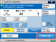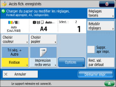 Pour imprimer un fichier mémorisé sur la machine depuis un ordinateur avec les réglages définis lors de la mémorisation du fichier, éviter d'imprimer le fichier depuis l'écran Chger réglages impr. Si l'impression est effectuée à partir de cet écran, il se peut que les réglages définis lors de la mémorisation du fichier ne soient pas utilisés.