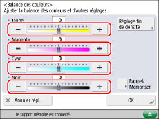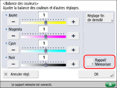 Spécifier les réglages de balance des couleurs et de densité à mémoriser → appuyer sur [Rappel/Mémoriser].