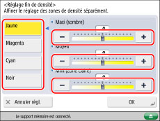 Sélectionner la couleur à régler → appuyer sur [-] ou [+] pour régler le niveau de densité des zones foncées (élevé), normales et claires (faible) → appuyer sur [OK].