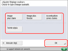 Il est impossible de régler le mode Teinte sépia lorsque des fichiers au format CMJN sont sélectionnés. Si l'on appuie sur [Démarrer impr.] avec le mode Teinte sépia défini, un message invitant à réinitialiser les réglages s'affiche à l'écran.