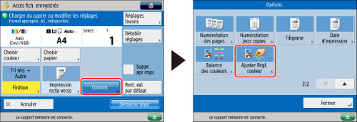 Les réglages du mode Ajuster Régl. couleur sont actuellement des réglages prédéfinis de balance des couleurs. Par conséquent, si les réglages du mode Ajuster Régl. couleur sont modifiés, tout réglage apporté à la balance des couleurs est aussi changé.