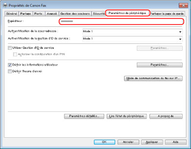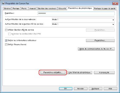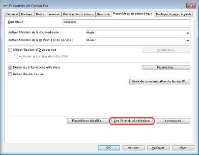 Si l'on utilise une imprimante partagée, il est nécessaire d'installer le Canon Driver Information Assist Service sur le serveur d'impression de l'ordinateur afin de pouvoir utiliser la fonction [Lire l'état du périphérique]. Pour plus d'informations sur l'installation de Canon Driver Information Assist Service, voir le "Guide d'installation du pilote de télécopie" (voir "Installation").