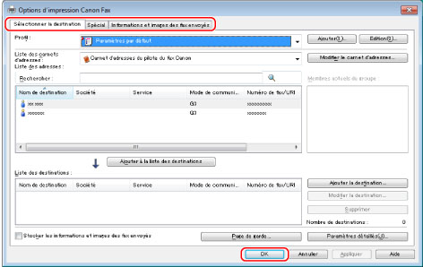 Au moment de l'envoi, il est possible, dans l'écran du pilote de télécopie, de modifier les paramètres par défaut en fonction des besoins.