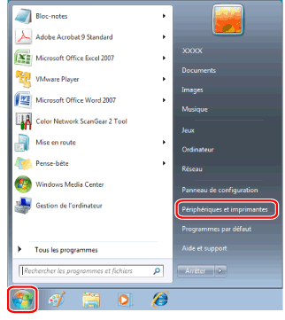Paramètres] → [Panneau de configuration] → [Périphériques et imprimantes].Sous Windows Vista/Server 2008, cliquer sur [