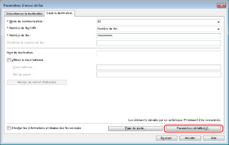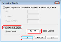 Sélectionner [Définir l'heure d'envoi] dans la boîte de dialogue [Paramètres détaillés] → indiquer l'heure d'envoi de la télécopie → cliquer sur [OK].