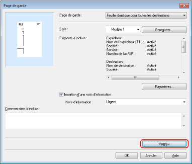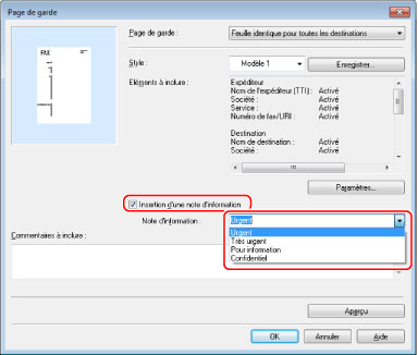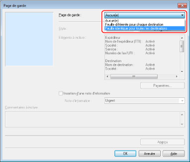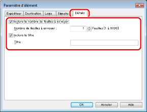 Pour inclure un titre ou le nombre de feuilles à envoyer sur la page de garde, cliquer sur [Détails] → sélectionner les éléments à inclure → spécifier les informations.