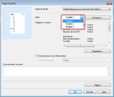 La page de garde spécifiée est jointe à la télécopie lors de l'envoi.