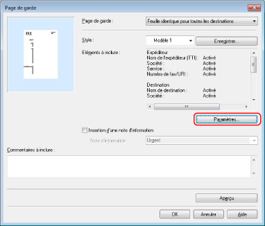 Si l'on souhaite définir les éléments devant figurer sur la page de garde, cliquer sur [Paramètres].