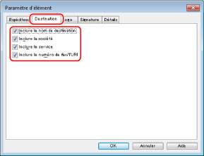 Cliquer sur [Destination] → sélectionner les éléments relatifs au destinataire qui devront être imprimés sur la page de garde.
