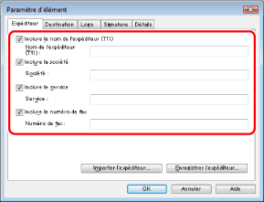 Pour enregistrer les informations entrées dans l'onglet [Expéditeur] dans un fichier, cliquer sur [Enregistrer l'expéditeur]. Lors de l'envoi d'une télécopie, il est possible d'importer les informations à l'aide de l'option [Importer l'expéditeur], pour ne pas avoir à entrer les données de l'expéditeur à chaque envoi de télécopie.