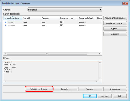 Cliquez sur [Spécifier un dossier] dans la boîte de dialogue [Modifier le carnet d'adresses].