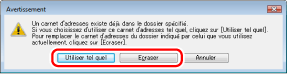 Si un carnet d'adresses existe déjà dans le dossier spécifié à l'étape 3, le message suivant apparaît. Pour utiliser le carnet existant, cliquer sur [Utiliser tel quel] et pour utiliser le carnet d'adresses du pilote de télécopie, cliquer sur [Ecraser].