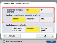 Se si aumenta <Livello riconoscimento immagini grafiche>, aumenta anche la dimensione dei dati. È consigliabile selezionare dapprima il livello [Normale] e, se il risultato ottenuto non è soddisfacente, provare ad aumentare il livello impostando [Moderato] o [Alto].