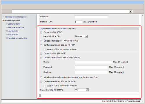 selezionare questa opzione per confermare la validità del certificato SSL quando si riceve con POP. Selezionare [Aggiunta CN a elementi da verificare] se si desidera confermare il CN (Nome Comune).