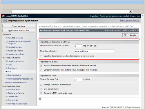 (Impostazioni/Registrazione) → [Impostazioni funzione] → [Invio] → [E-mail/I-Fax] → [Impostazioni comunicazione].La funzione I-fax delle macchine imageRUNNER ADVANCE utilizza il protocollo SMTP per la trasmissione.