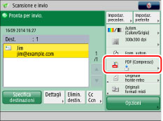 Per "Nome mittente" e "Rispondere a" è possibile solo selezionare impostazioni memorizzate in precedenza. Non è possibile immettere una nuova destinazione nella schermata delle Opzioni. Memorizzare la destinazione in Impostazioni/Registrazione. Il "Nome mittente" visualizzato nella schermata di ricezione corrisponde al nome dell'unità impostato per la macchina imageRUNNER ADVANCE che sta inviando. Non viene rispecchiata l'impostazione del "Nome mittente".