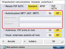 se l'ambiente del server e-mail richiede l'autenticazione SMTP, specificare 'On' per questa impostazione e immettere il nome utente e la password.