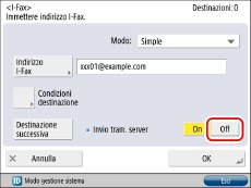 (Impostazioni/Registrazione) → [Impostazioni funzione] → [Invio] → [Impostazioni e-mail/I-Fax] → [Utilizzare Invio via server].
