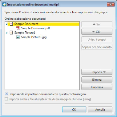 (Output del fax). Nella finestra di dialogo [Impostazione ordine documenti multipli], specificare l'ordine per rilegare più documenti come singolo documento raccoglitore.
