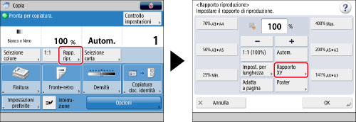 Se si imposta [Rappor. XY automatico], selezionare il formato carta mediante il modo Selezione manuale carta. Se non si seleziona un formato carta, viene selezionato automaticamente il cassetto 1 e il rapporto di riproduzione viene impostato in base al formato della carta caricata in quel cassetto.