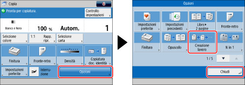 Possono essere variate solo le impostazioni visualizzate in [Variaz. impost.] nel modo Creazione lavoro. Specificare in anticipo le impostazioni di copia/scansione necessarie. Tuttavia, se si specifica [N in 1] con il modo Creazione lavoro, non è possibile modificare le impostazioni per [Densità] o [Selezione colore].