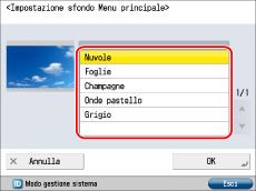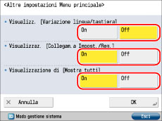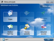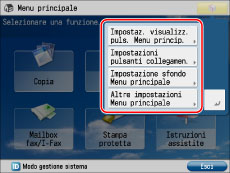 Le impostazioni della schermata Menu principale possono essere specificate solo da un utente con i privilegi richiesti. Per maggiori informazioni, vedere "Impostazione degli amministratori".