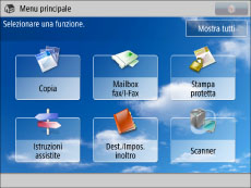 Se si preme [Mostra tutti] nella schermata Menu principale, vengono visualizzati tutti i pulsanti nell'ordine predefinito, anche se il layout dei pulsanti è stato modificato. Per ritornare alla schermata personalizzata, premere nuovamente [Mostra tutti].