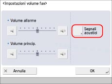 (Impostazioni volume) sul pannello comandi, è possibile regolare il volume dell'allarme di trasmissione/ricezione fax e il volume della trasmissione. È anche possibile impostare vari segnali da far emettere in funzione delle operazioni eseguite o dello stato della periferica.
