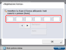 Se viene visualizzato il messaggio <Il valore della chiave di licenza è errato. Controllare la chiave di licenza.>, premere [OK] → immettere la chiave di licenza corretta.