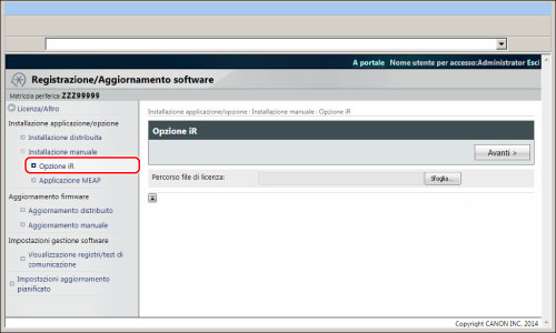 Dalla pagina del portale dell'IU remota, fare clic su [Impostazioni/Registrazione] → [Licenza/Altro] → [Registrazione/Aggiornamento software].