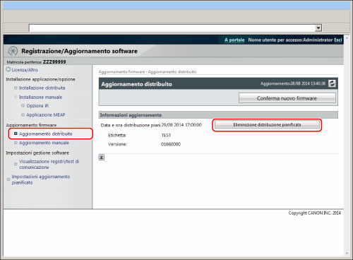 Premere [Aggiornamento firmware] → [Elim. distrib. pianificata].