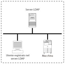 Un sistema di autenticazione utente che utilizza solo la macchina. Gli utenti da autenticare vengono registrati e gestiti tramite un database nella macchina. [Questa macchina] è la destinazione di accesso. Autenticazione periferica locale della macchina può essere utilizzato con la macchina per impostazione predefinita.