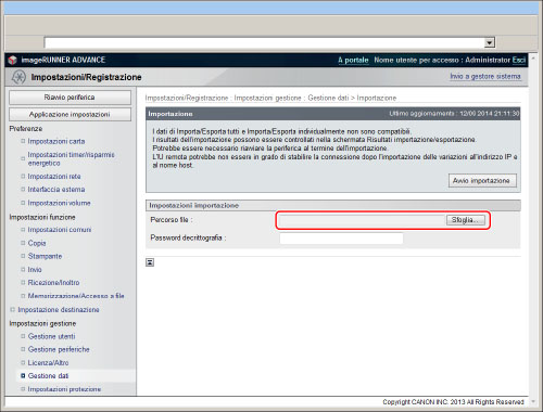 Tra le impostazioni importate in gruppo, alcune impostazioni vengono abilitate solo dopo il riavvio della macchina. Dopo l'importazione, non sarà possibile utilizzare l'IU remota per eseguire altre operazioni sino al riavvio della macchina. Spegnere e riaccendere la macchina con l'interruttore principale. (Vedere "Alimentazione principale e tasto risparmio energetico".)