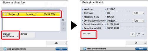 Selezionare la coppia di chiavi per il certificato CA da controllare → premere [Dettagli certificato] → [Verif. certif.].