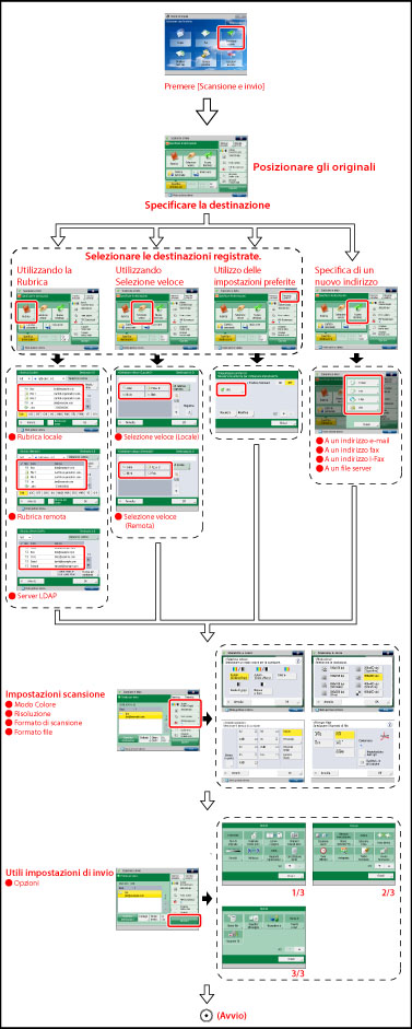 Per poter inviare i documenti acquisiti ad un indirizzo e-mail, ad un indirizzo I-fax oppure ad un file server, si devono configurare le impostazioni della rete. (Vedere "Impostazioni di comunicazione comuni per e-mail/I-Fax".)