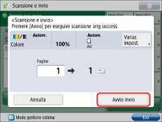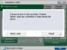 I lavori di invio possono essere annullati anche dalla schermata Monitoraggio stato/Annulla. (Vedere "Annullamento di un lavoro il cui invio è in corso o in attesa".).