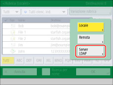 L'opzione [Variazione rubrica] viene visualizzata solo quando è registrata sia la Rubrica remota che il server LDAP. Se sulla macchina è registrato solo il server LDAP, viene visualizzato [A server LDAP].