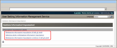 Le informazioni registrate possono essere eliminate solo sulla pagina Servizio di gestione informazioni di impostazione utente.