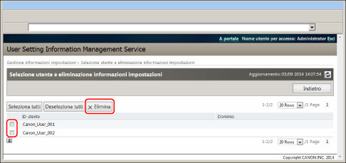 Selezionare le informazioni relative all'utente da eliminare → fare clic su [Elimina].